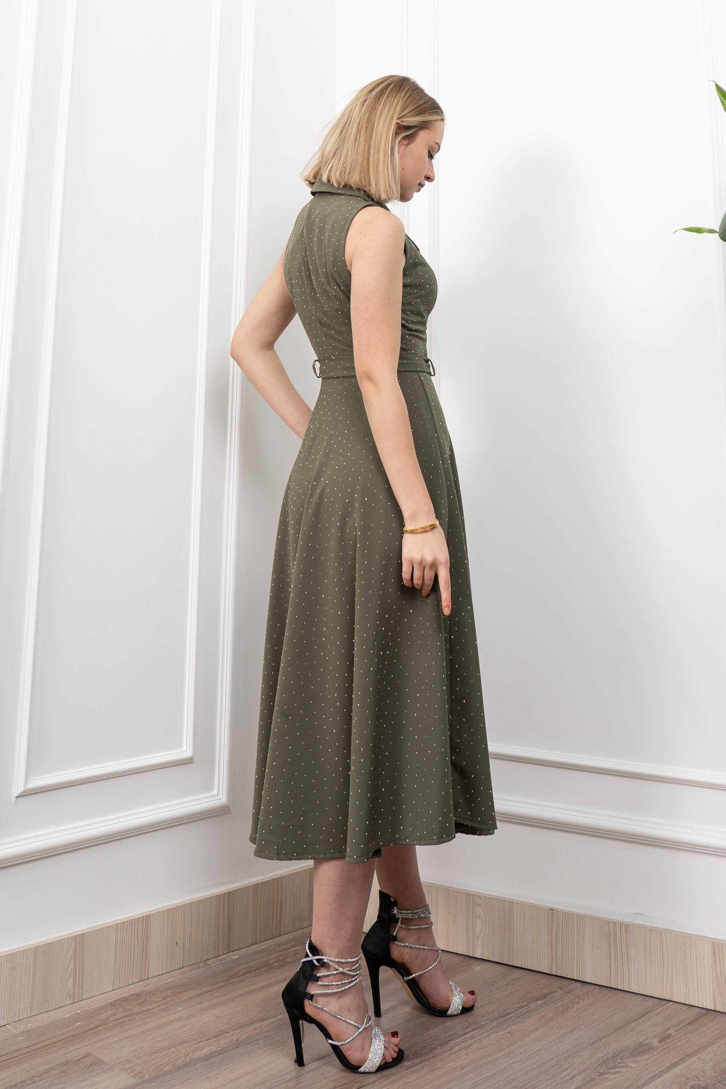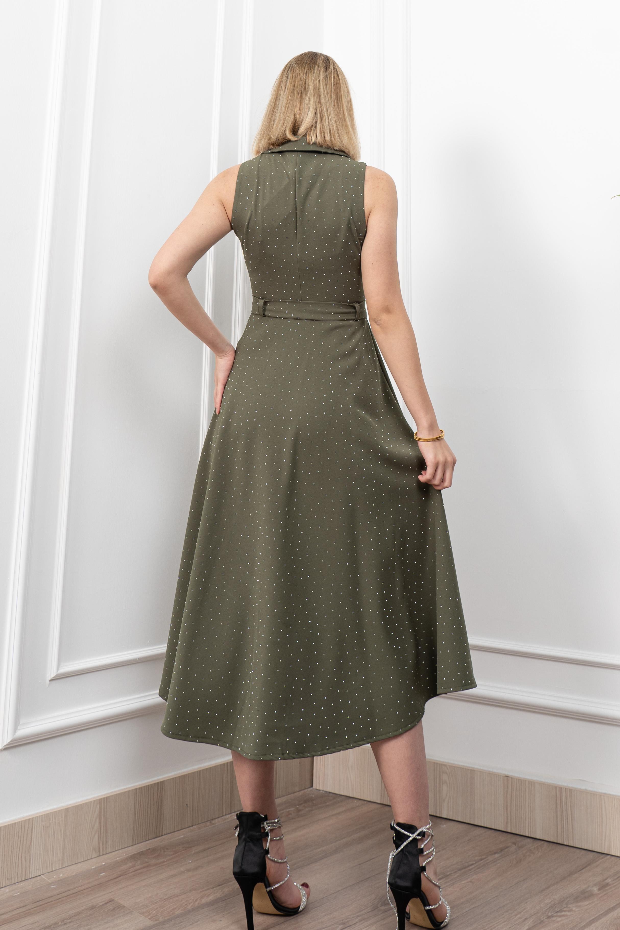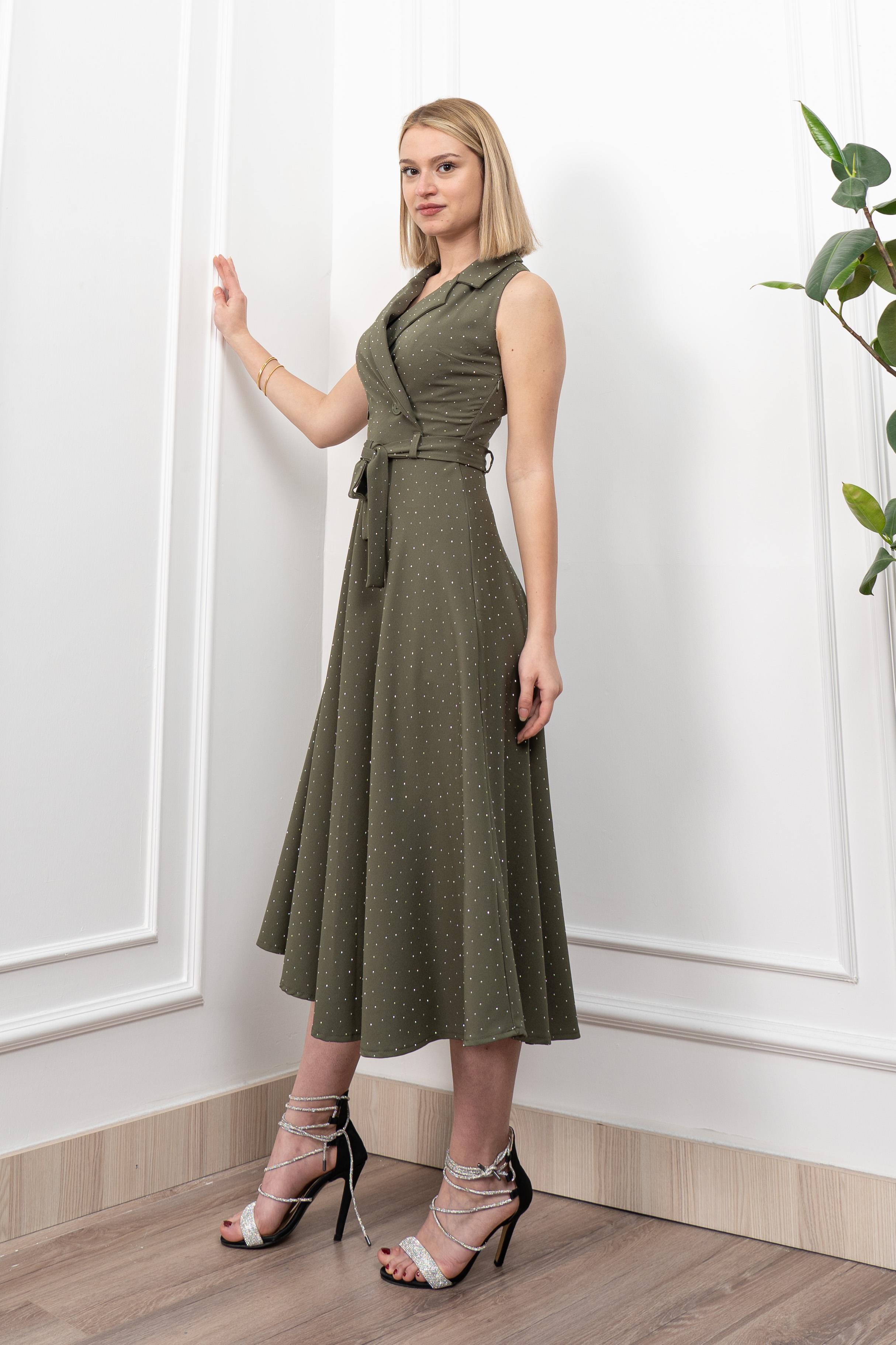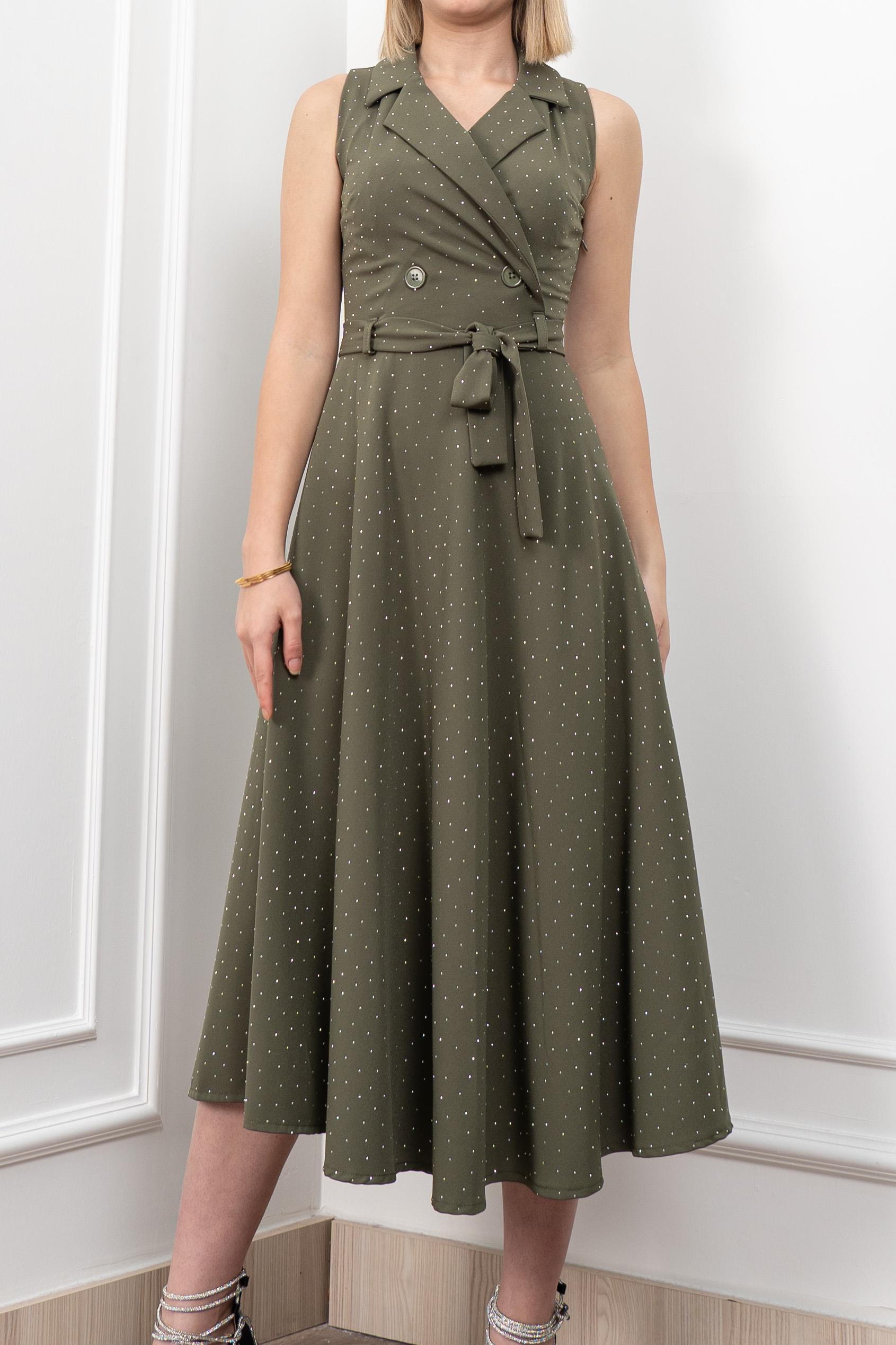 Beli Kuşaklı Yakalı Ve Taş Detaylı Uzun Elbise - Likralı Esnek iç göstermez
