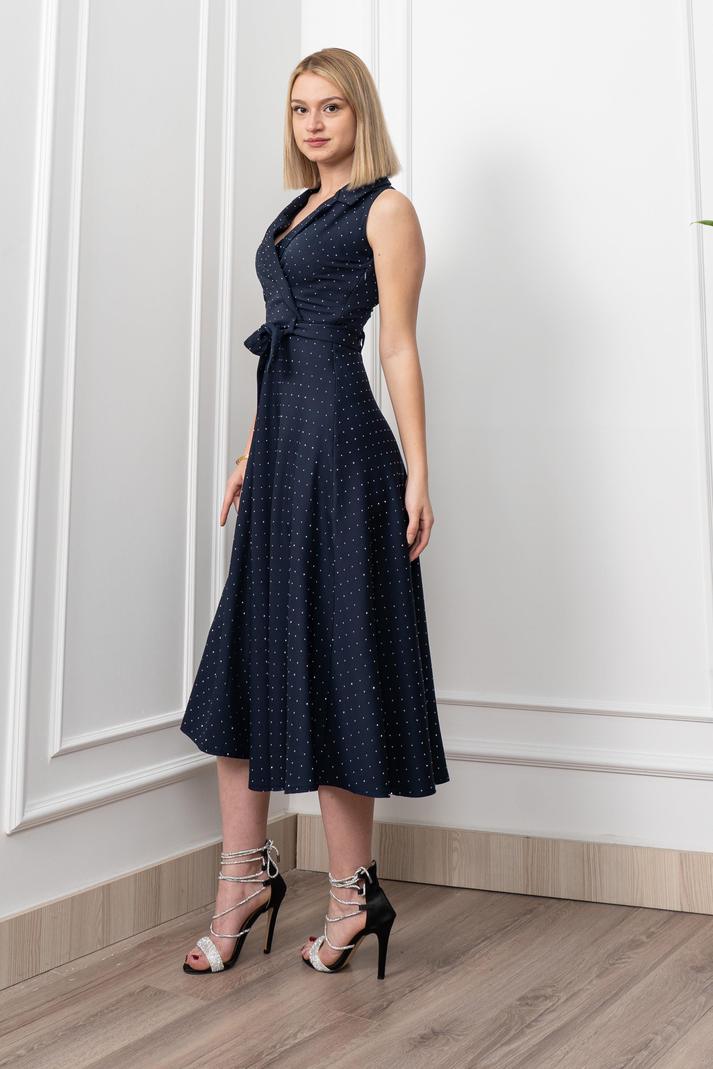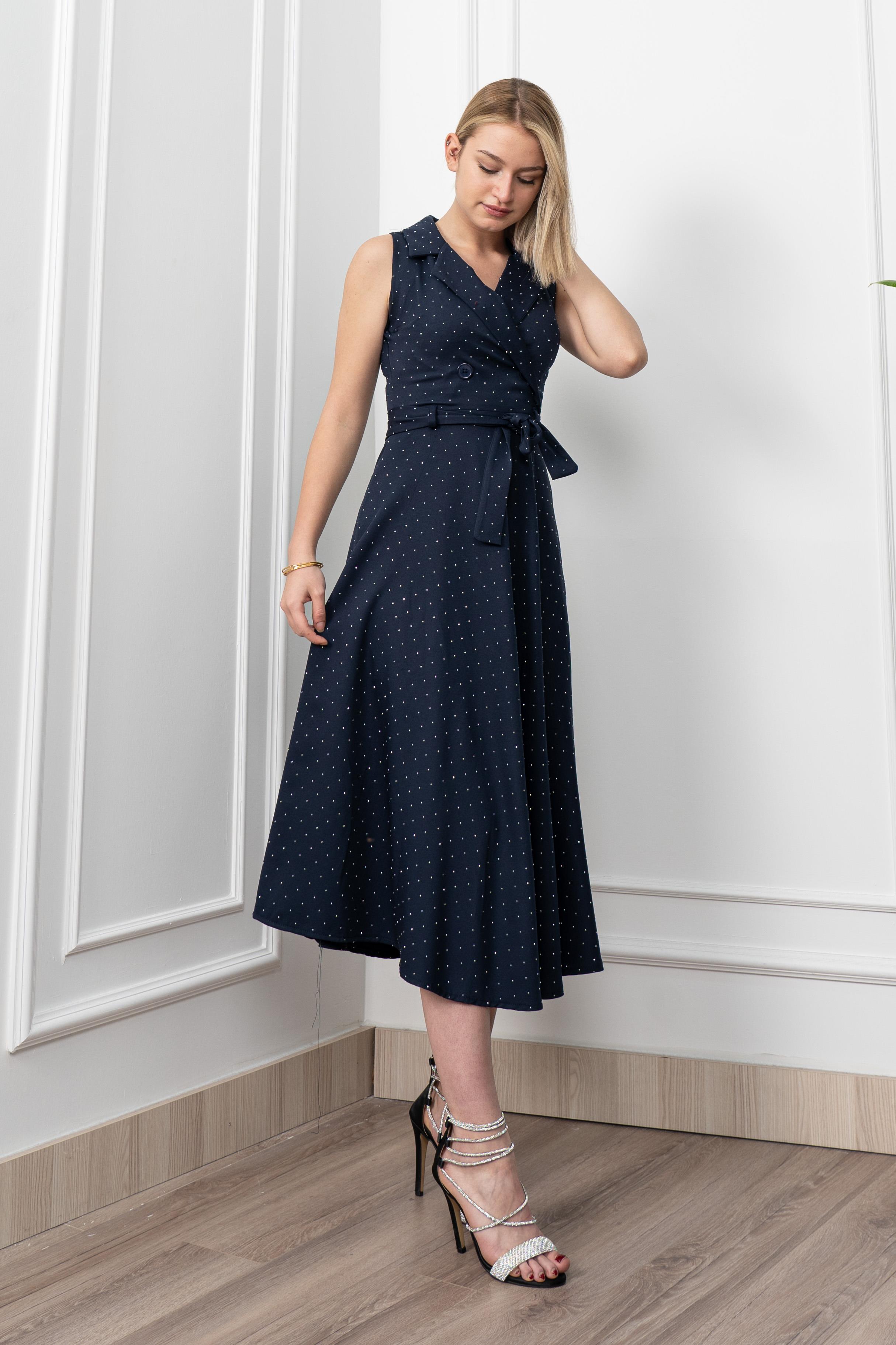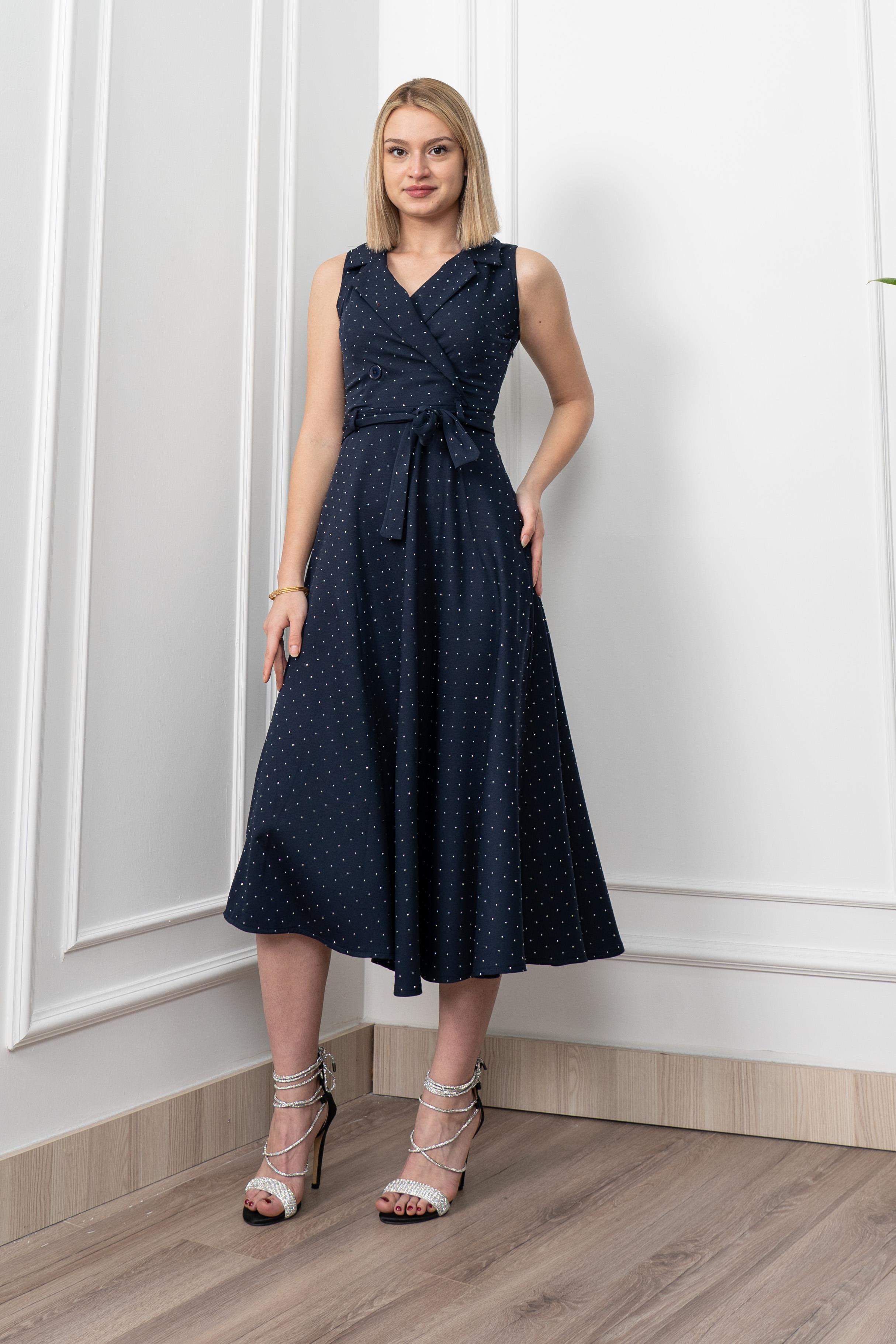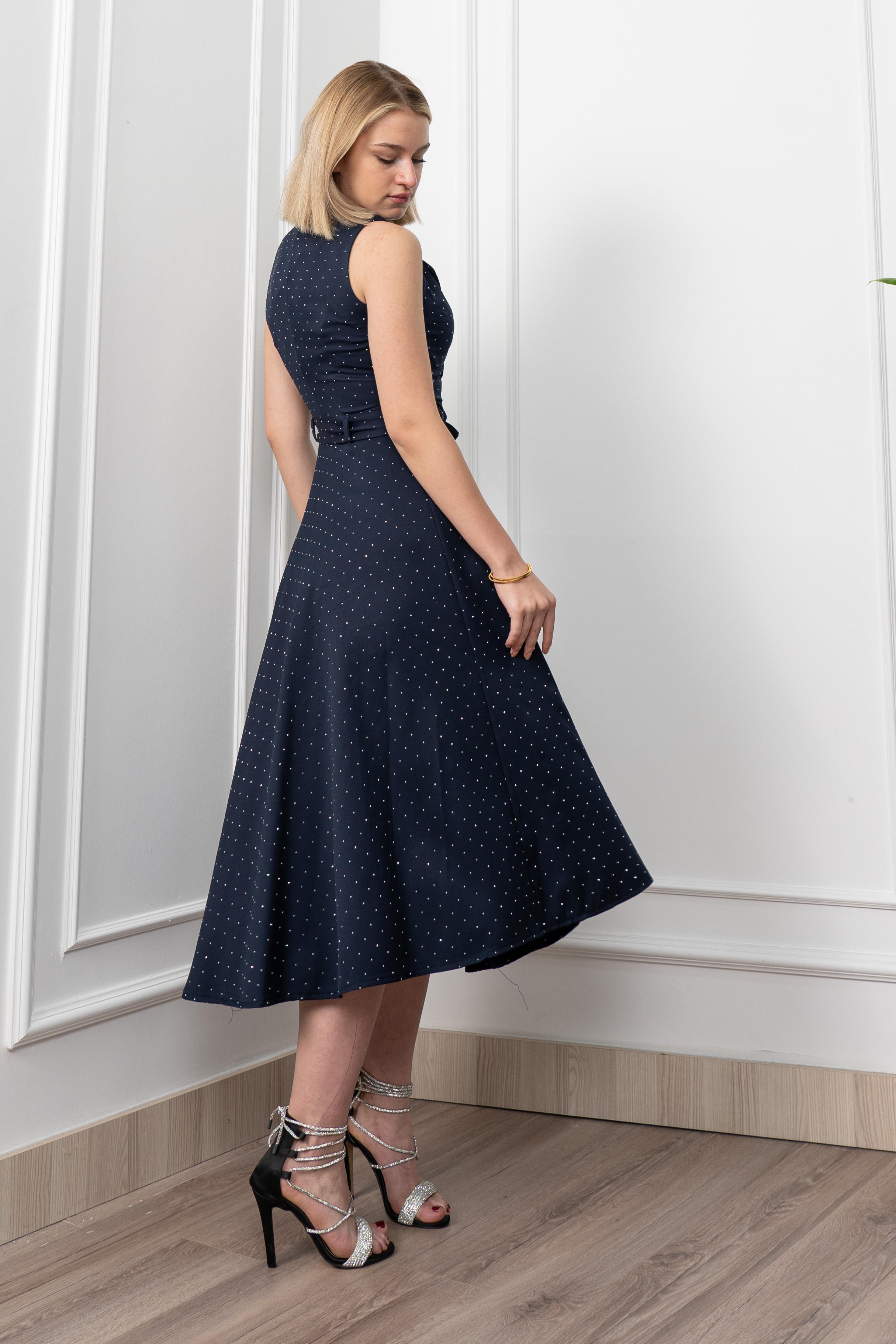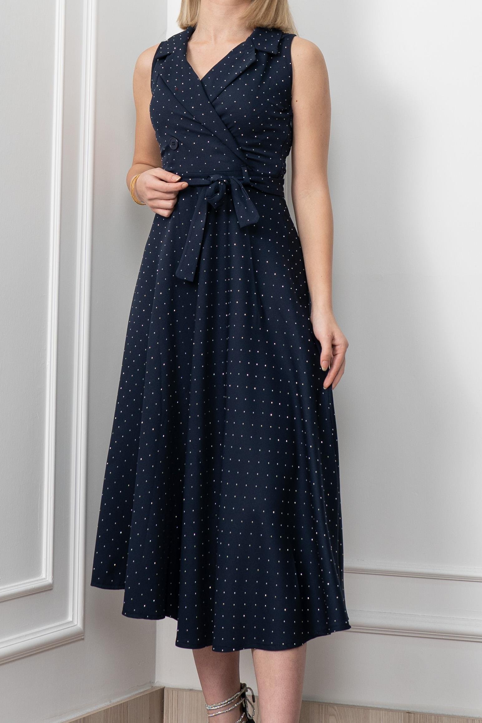 Beli Kuşaklı Yakalı Ve Taş Detaylı Uzun Elbise - Likralı Esnek iç göstermezÜrün Kodu:50338