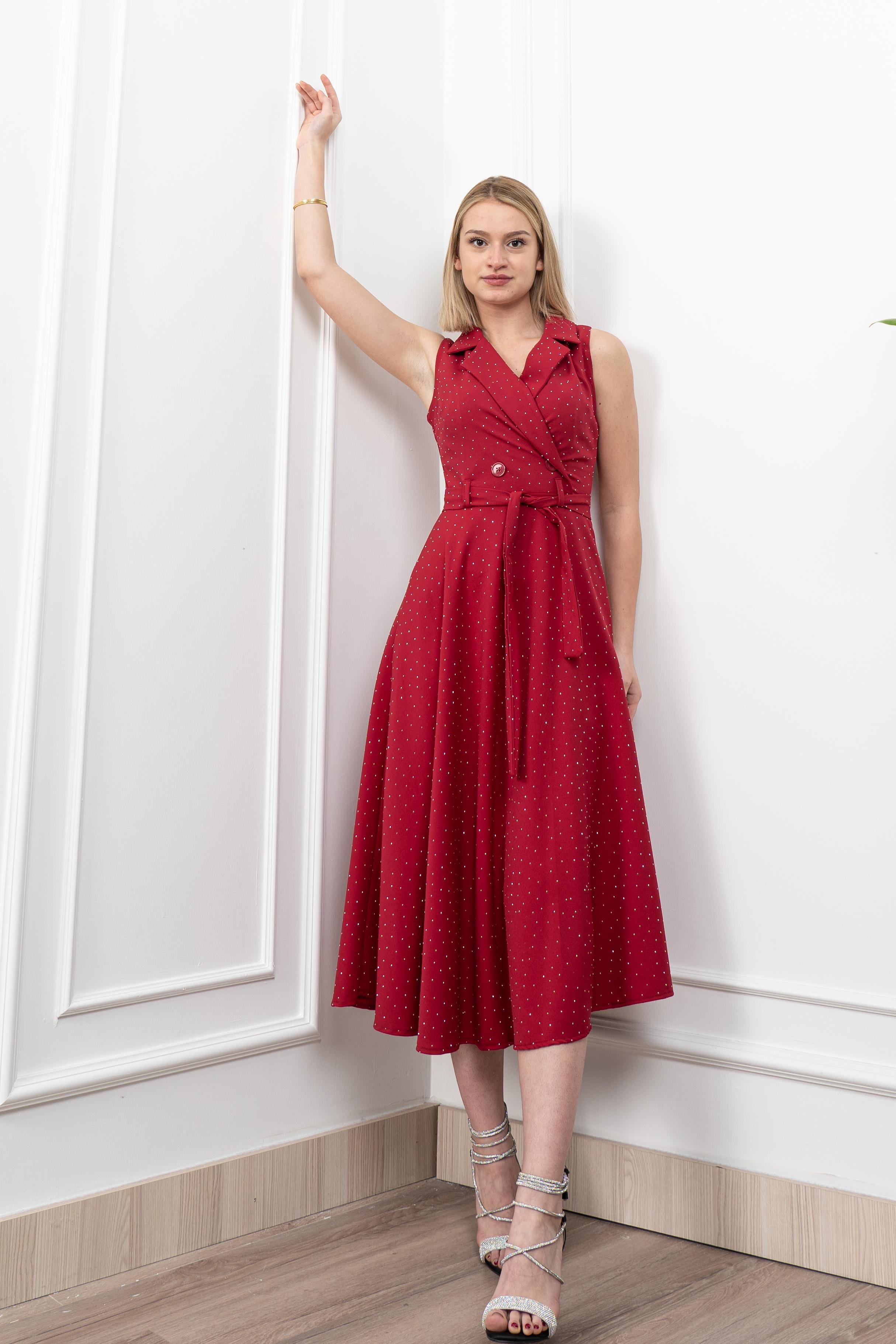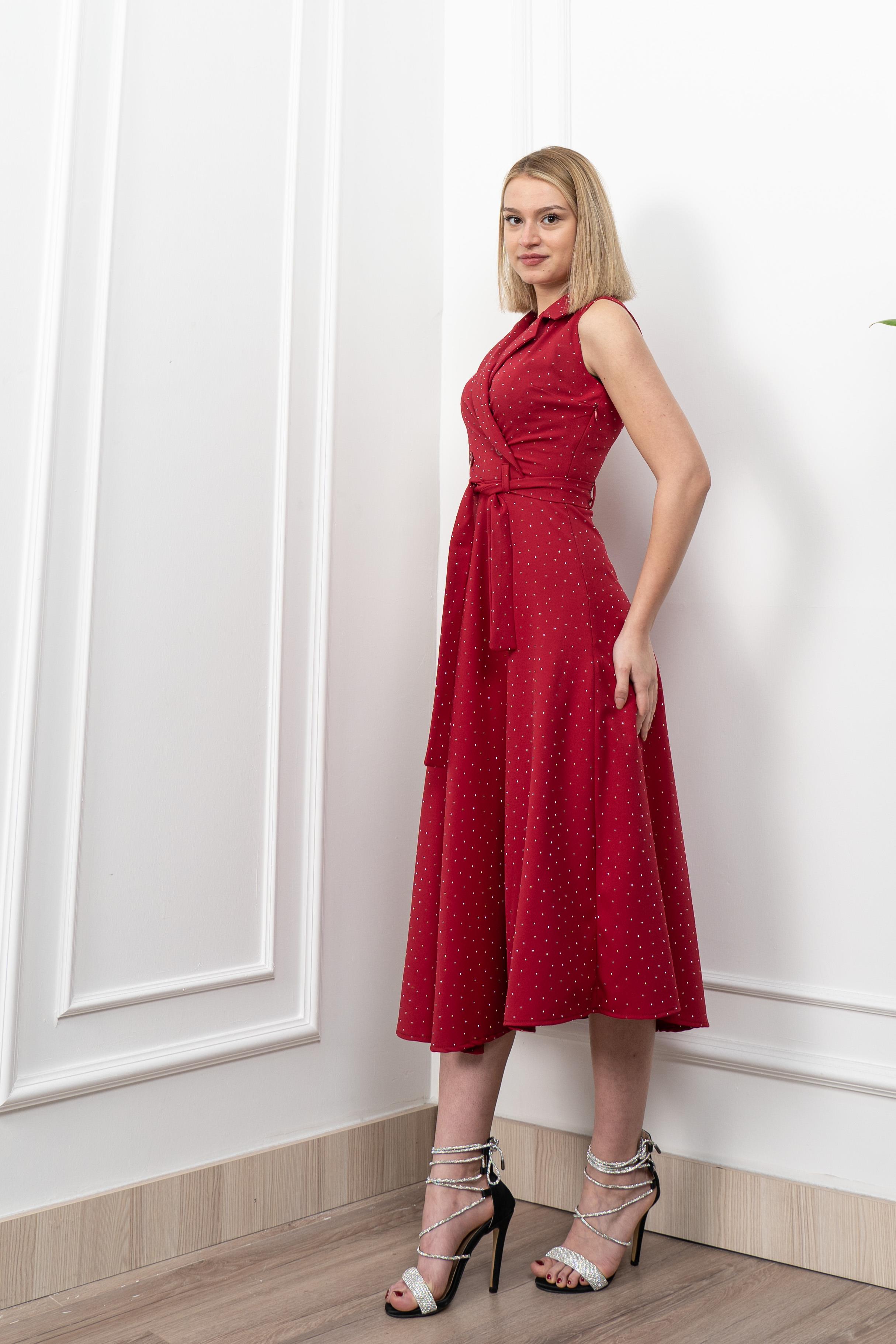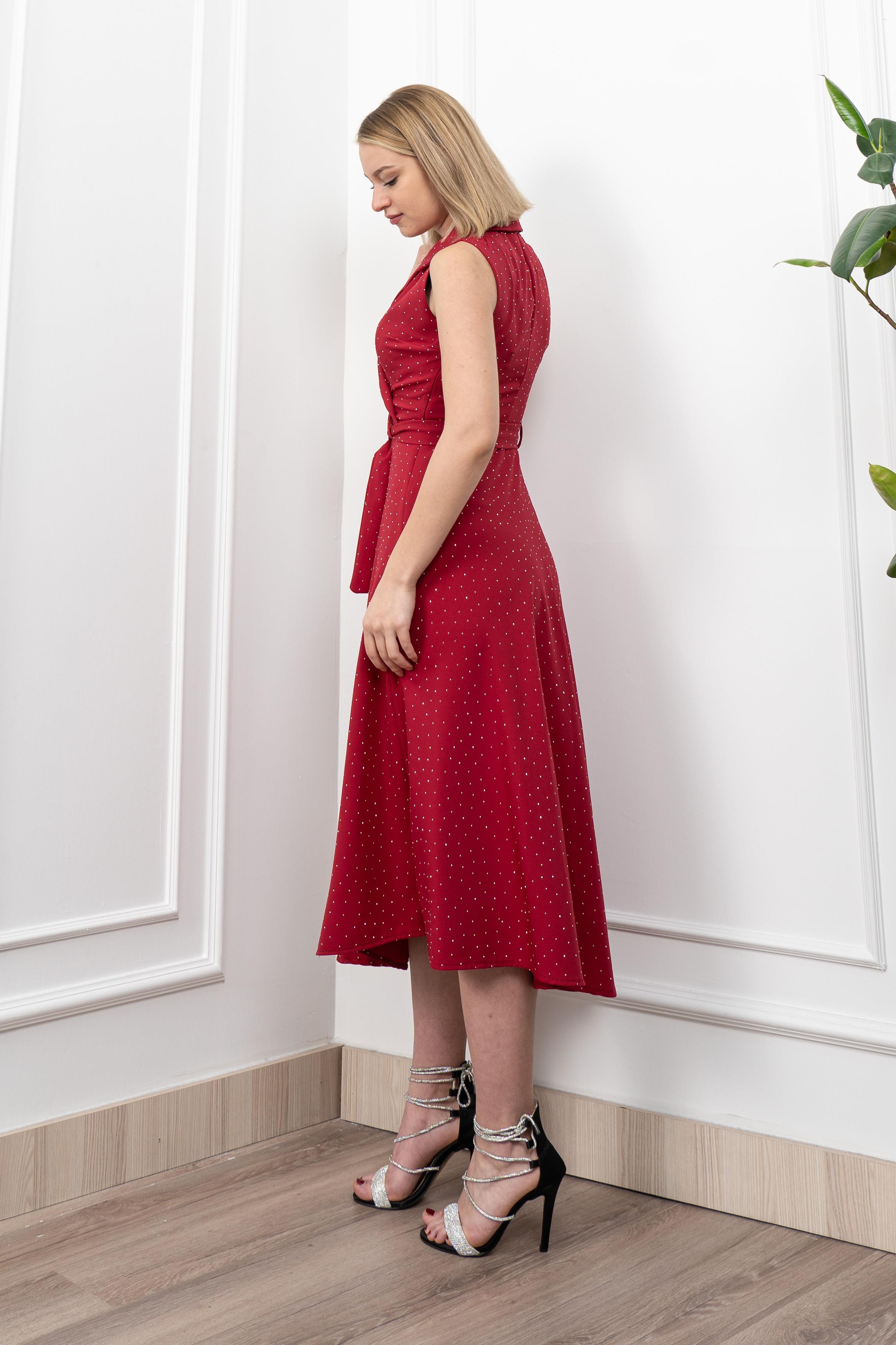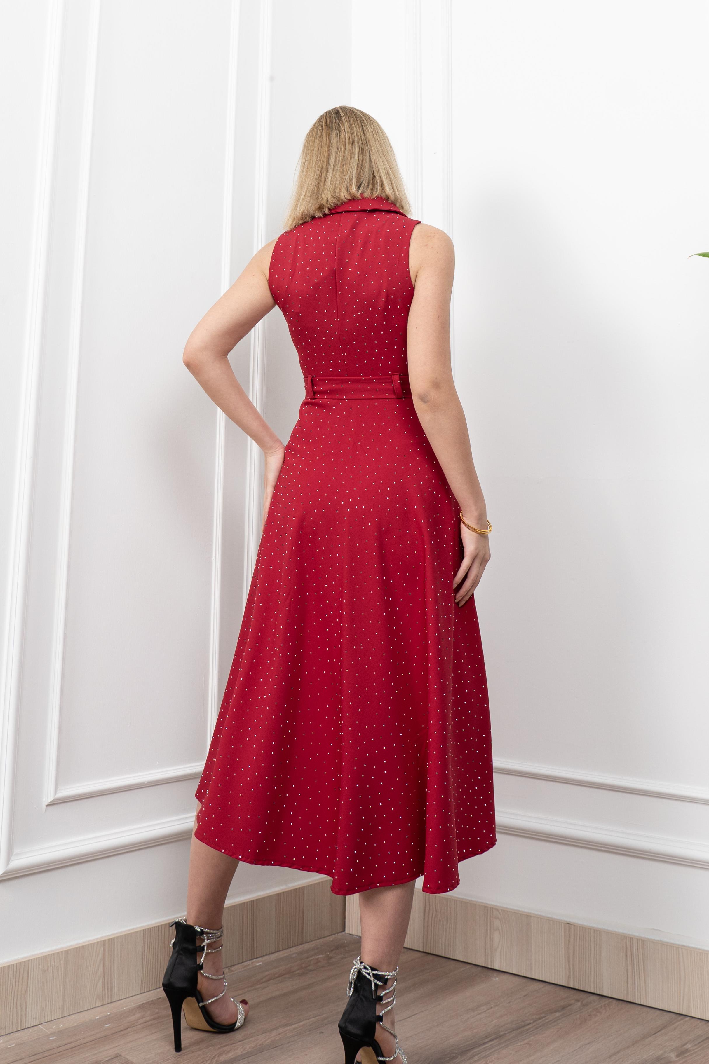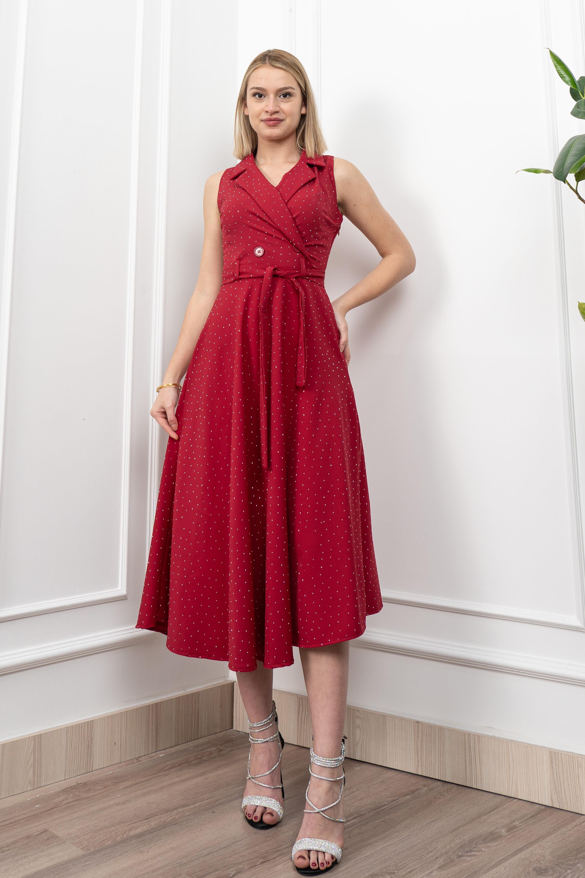 Beli Kuşaklı Yakalı Ve Taş Detaylı Uzun Elbise - Likralı Esnek iç göstermez
