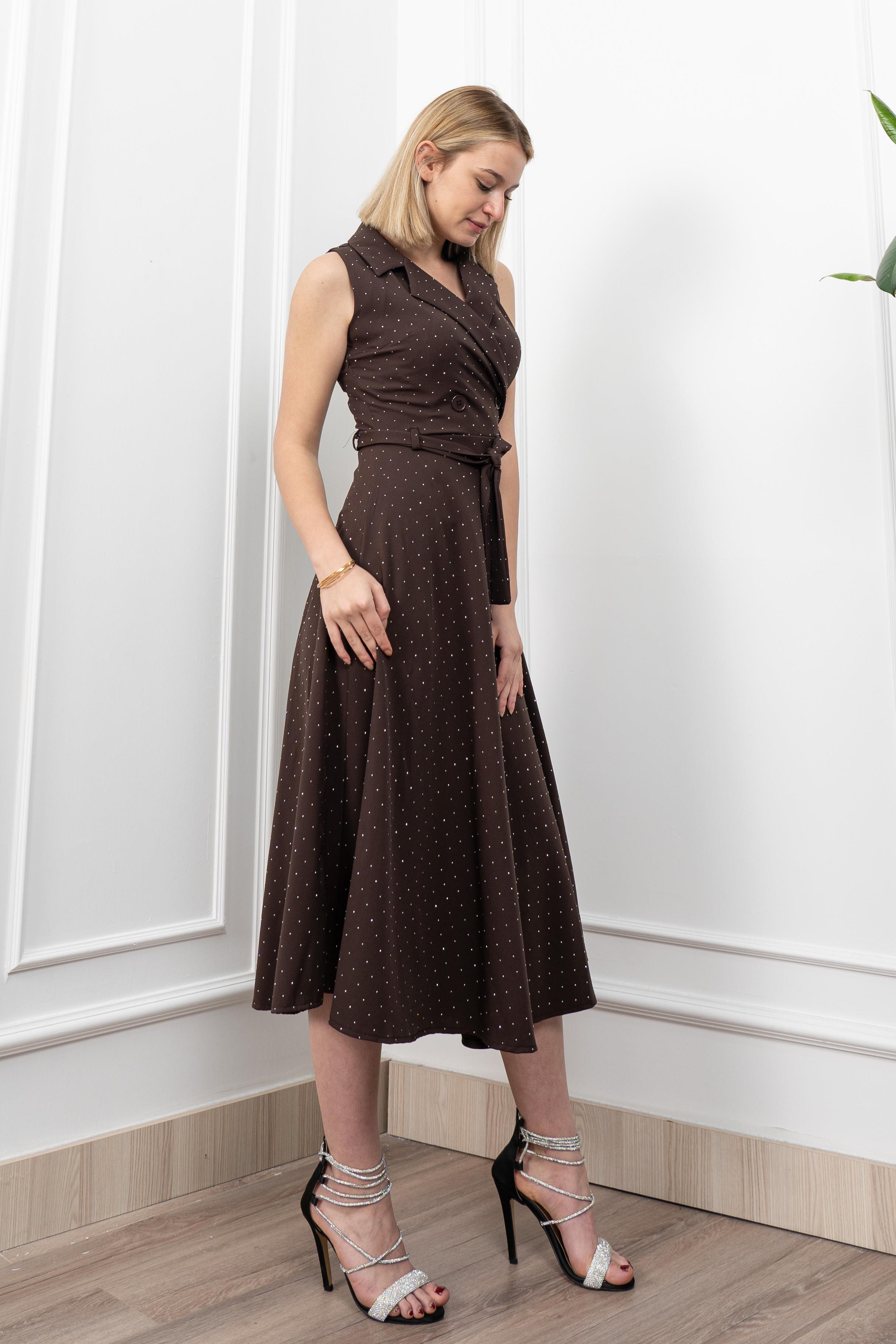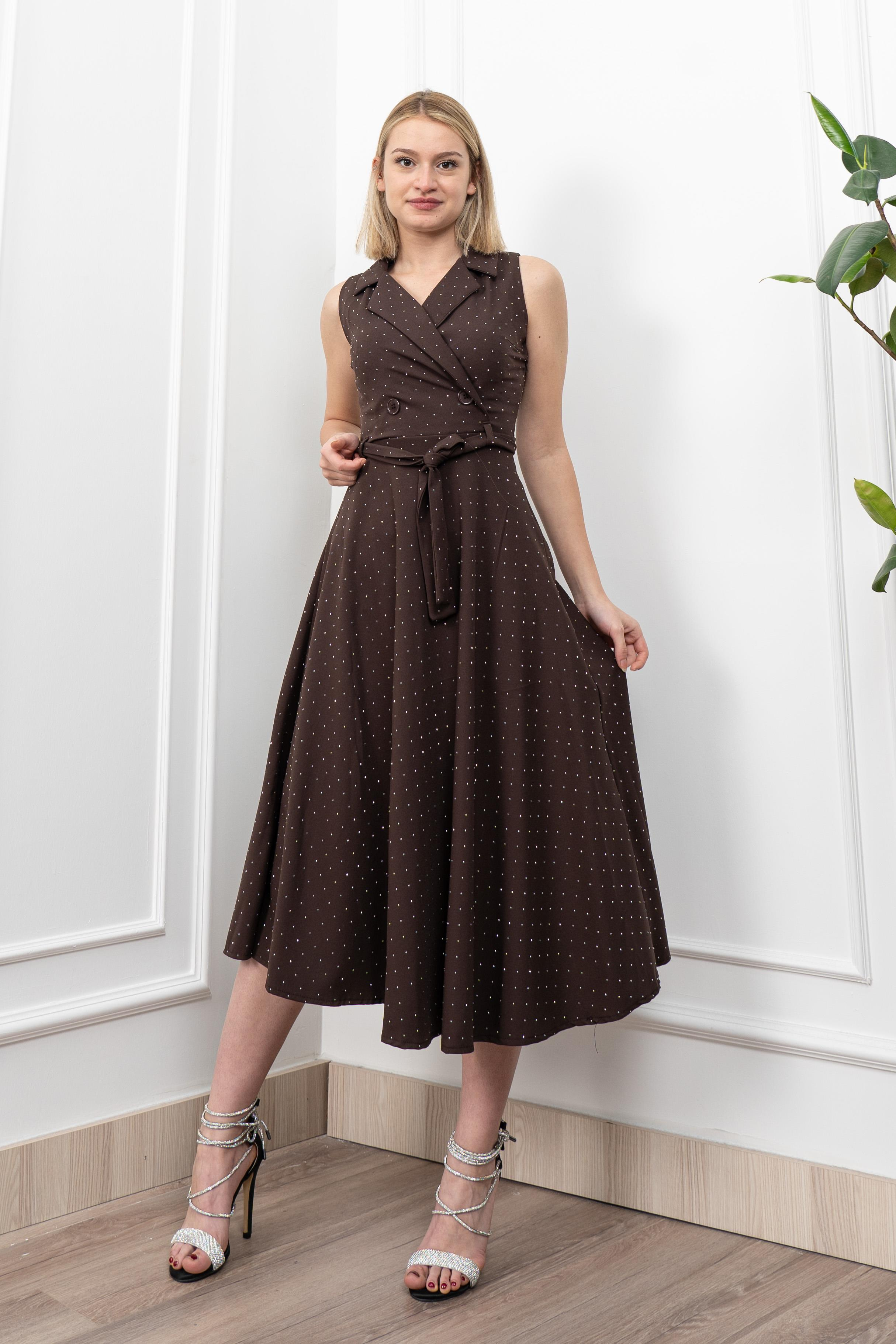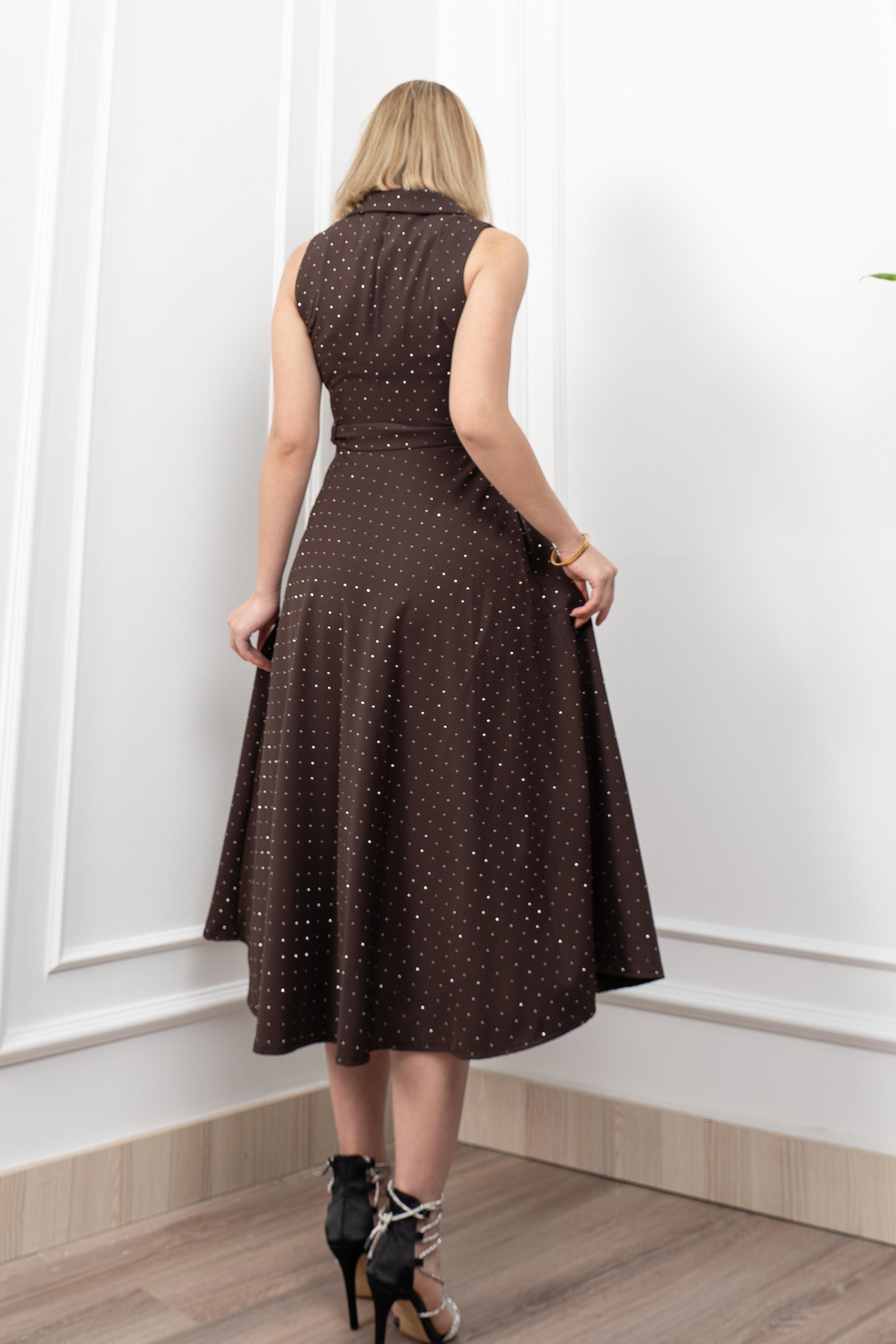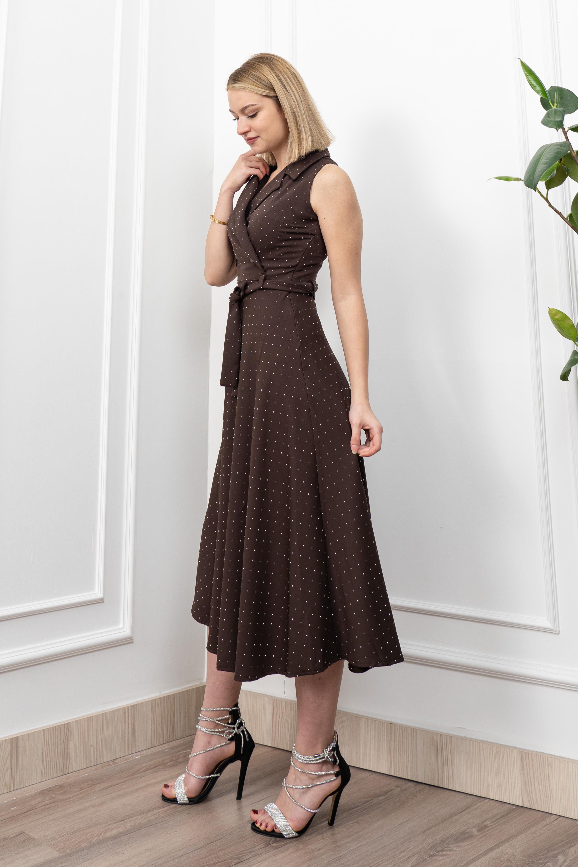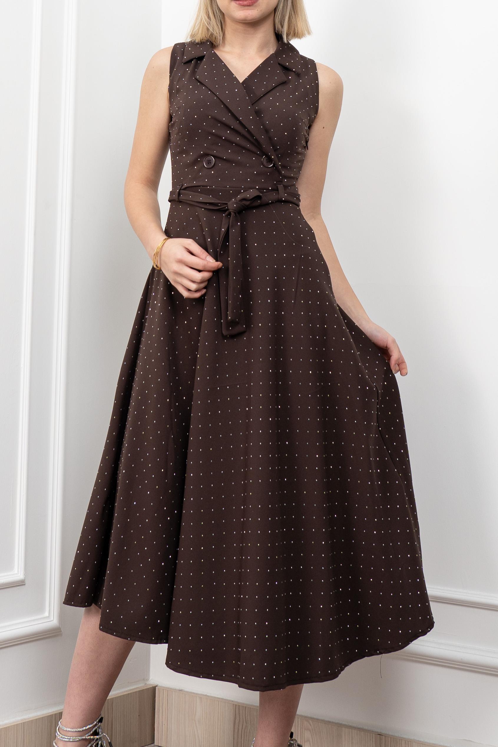 Beli Kuşaklı Yakalı Ve Taş Detaylı Uzun Elbise - Likralı Esnek iç göstermez