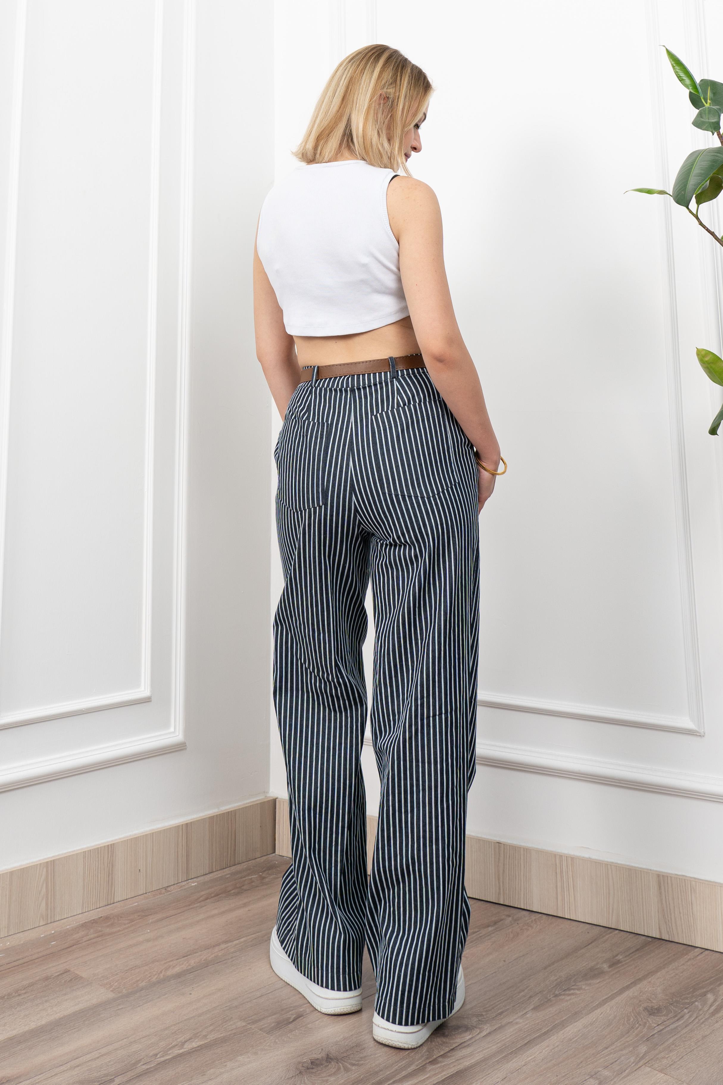 Kemerli ve Cepli çizgili pantolon , Likrasız ve esnemez