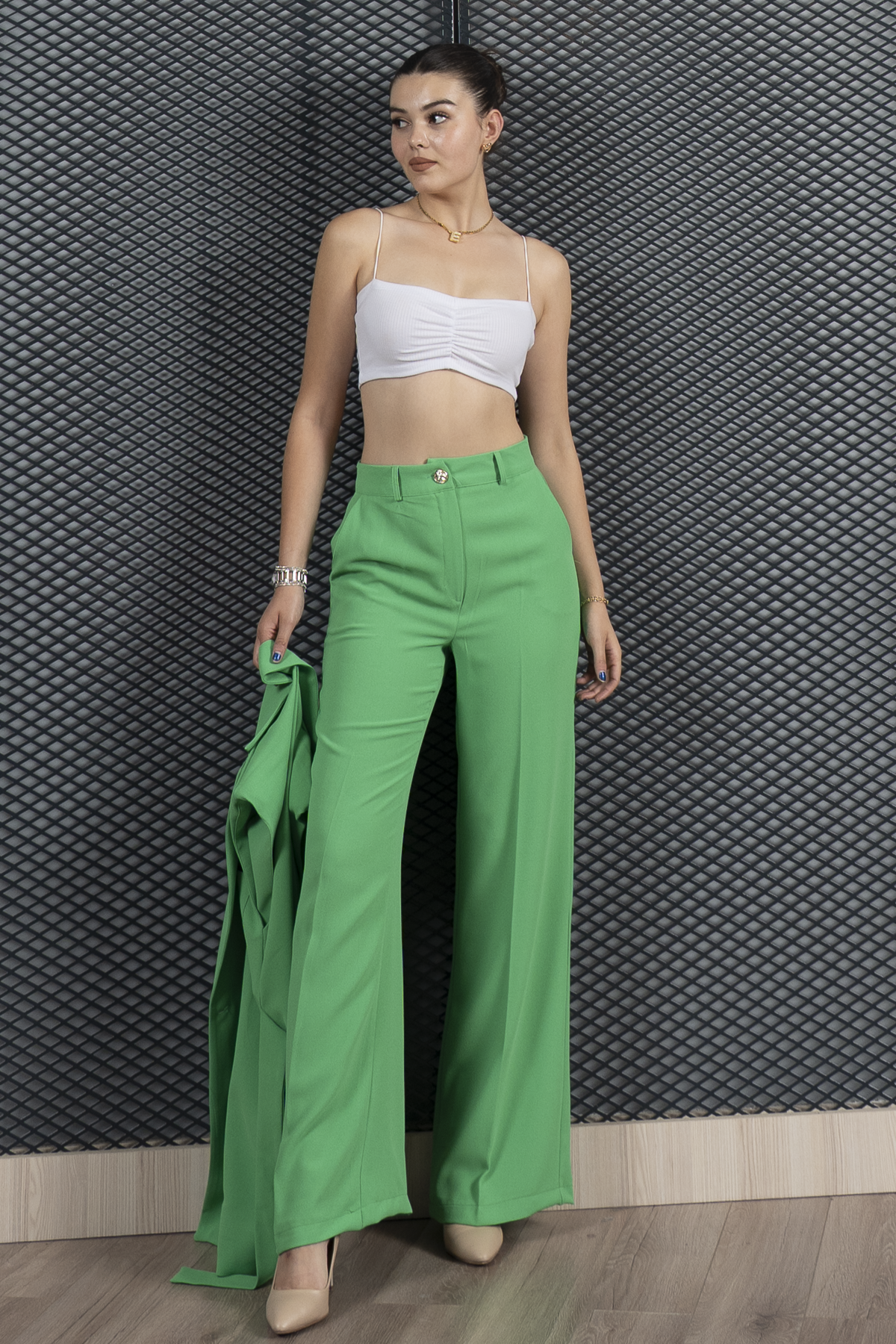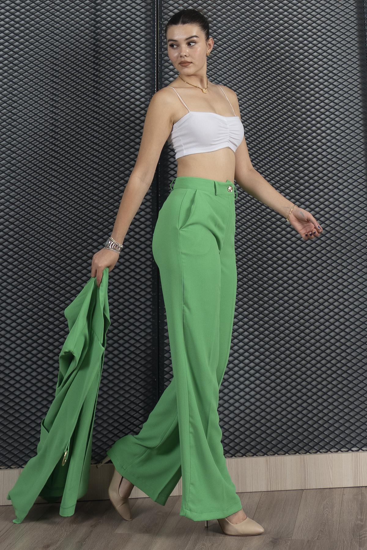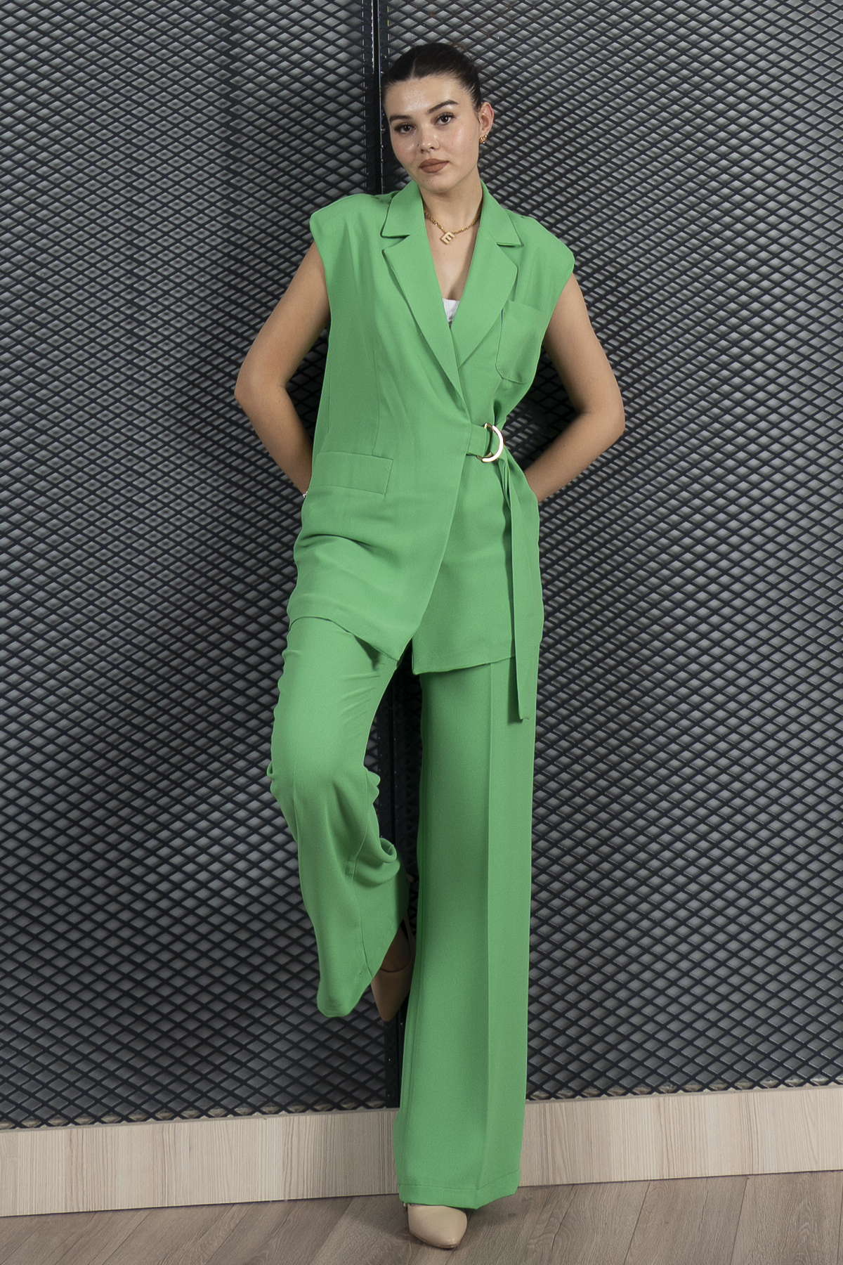 Güçlü bir duruş, zarif bir görünüm!💚 Omuzları vatkalı, kuşaklı uzun yelek ve rahat kesim bol paça cepli pantolon ile stilinizi bir adım öne taşıyın. Günlük şıklık ya da ofis zarafeti — karar sizin!