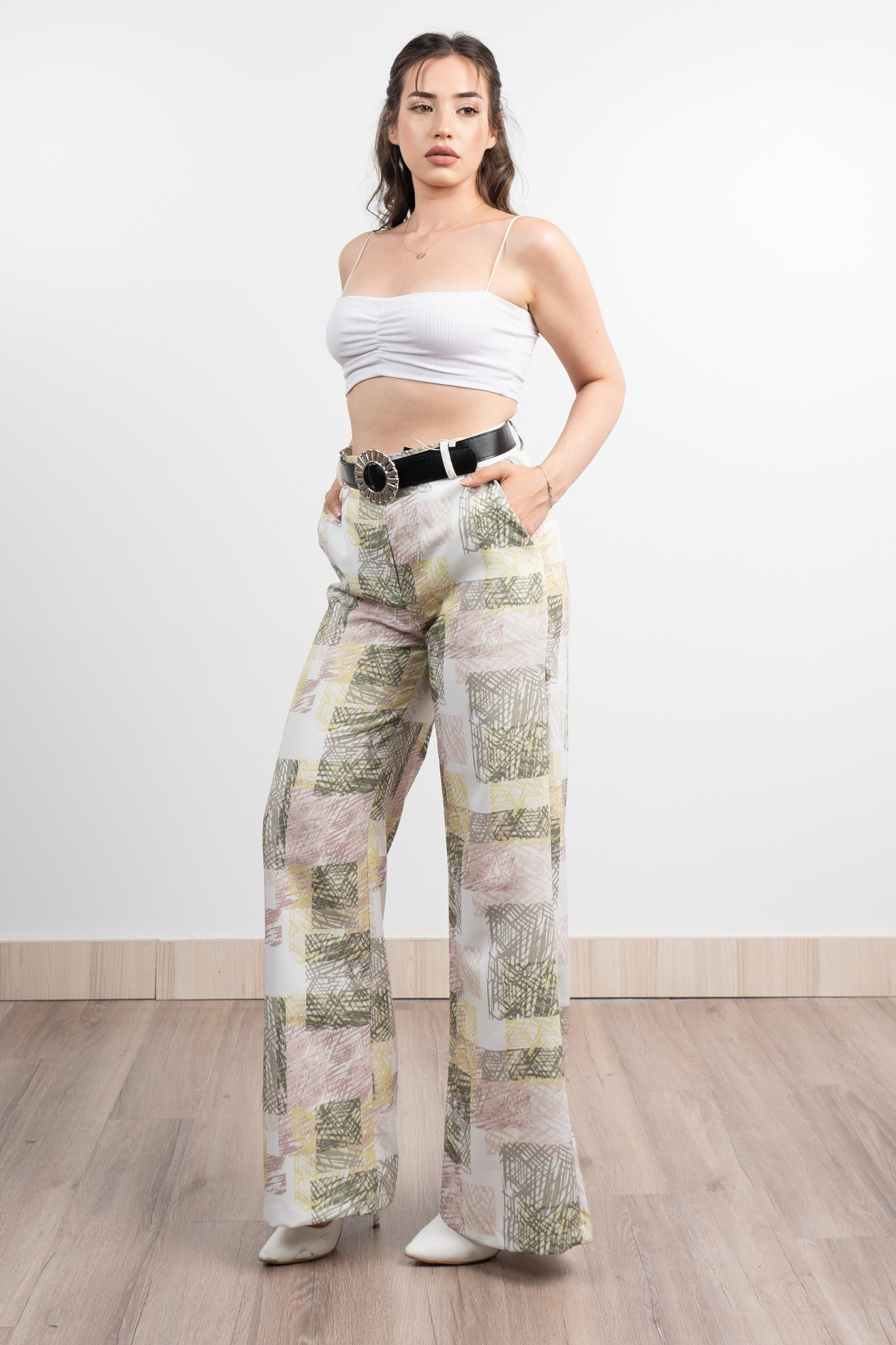 Renkli Bol Paça Kemerli ve Cepli Kumaş Pantolon 30031