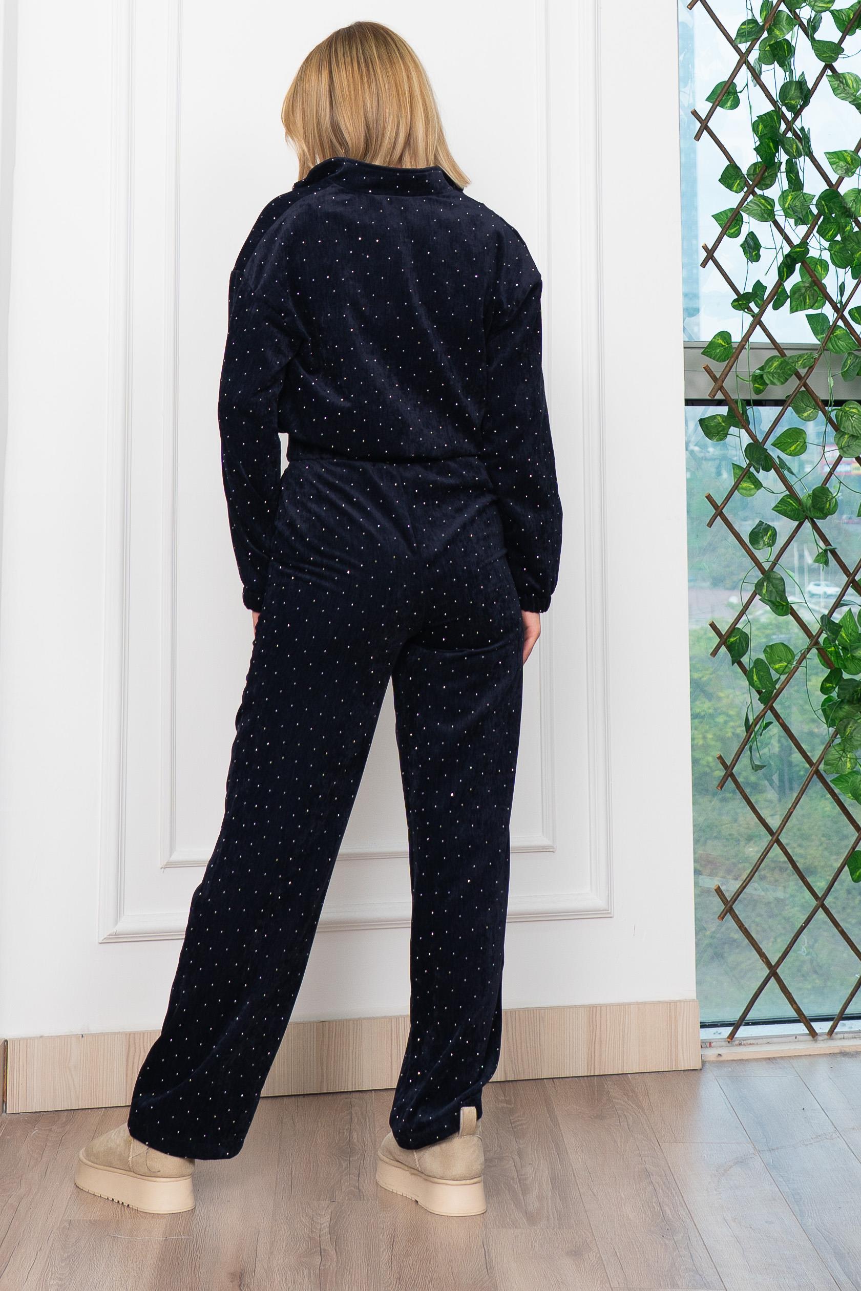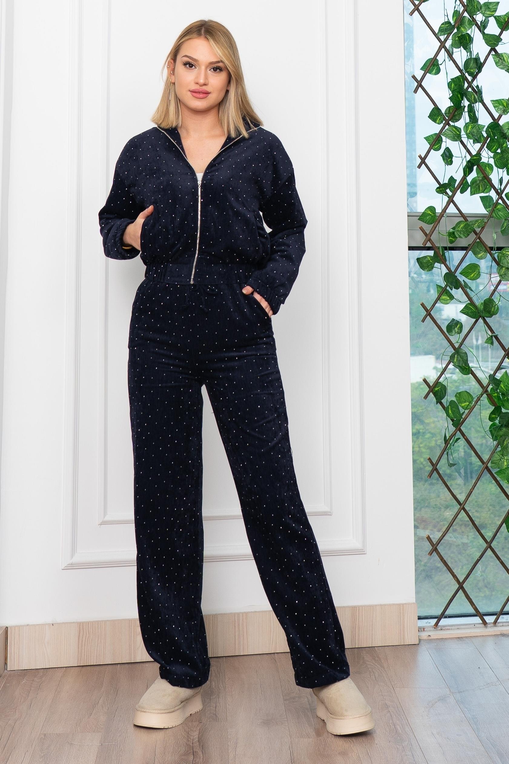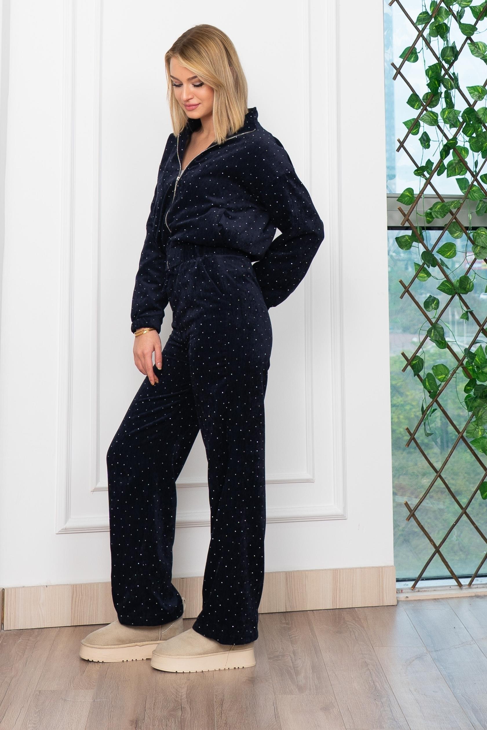 Taş detaylı, beli lastikli ve fermuarlı ceket ile taş işlemeli, boru paça pantolonun kombininden oluşan bu takım, hem ofiste hem de şık davetlerde rahatlıkla kullanılabilir. İç astarı ve kaliteli dokuma double krep kumaşı ile hem konforlu hem de fit bir görünüm sunuyor.