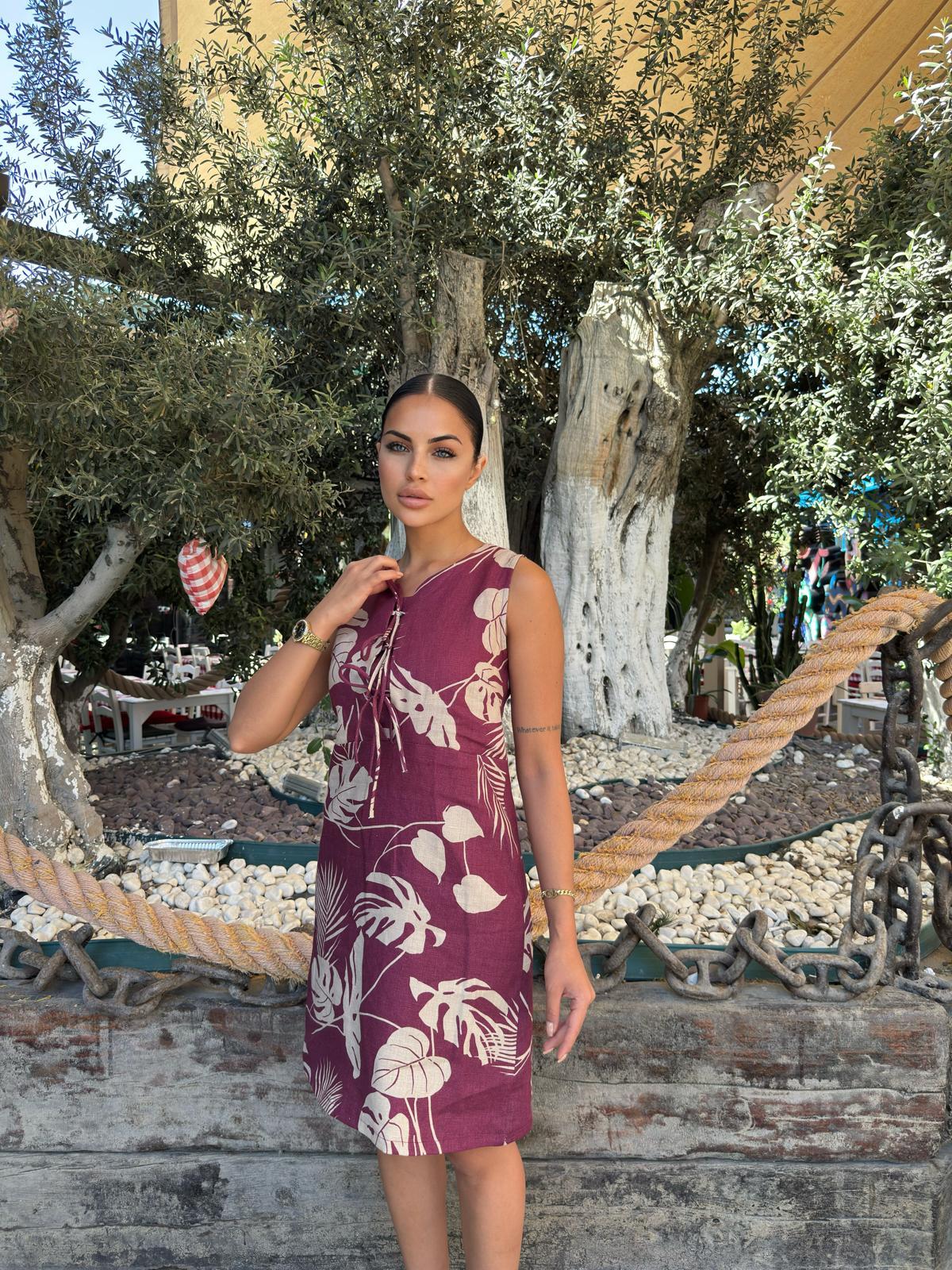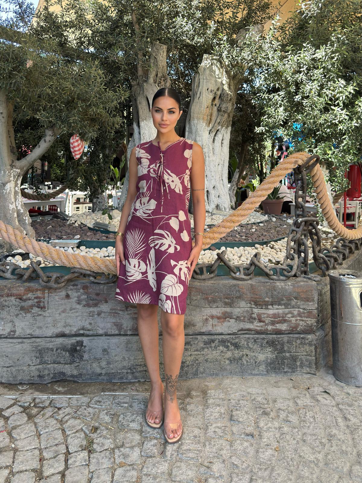 SHEILA YAPRAK DESENLİ KETEN ELBİSE