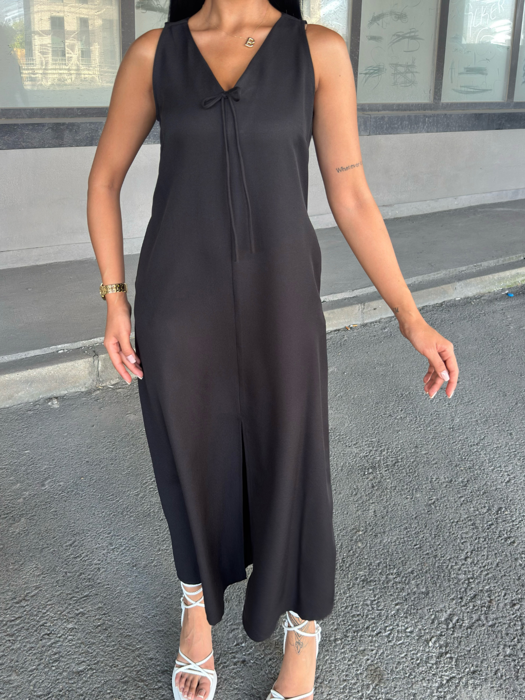 V Yaka Spagetti İp Detaylı Yırtmaçlı Uzun Elbise
