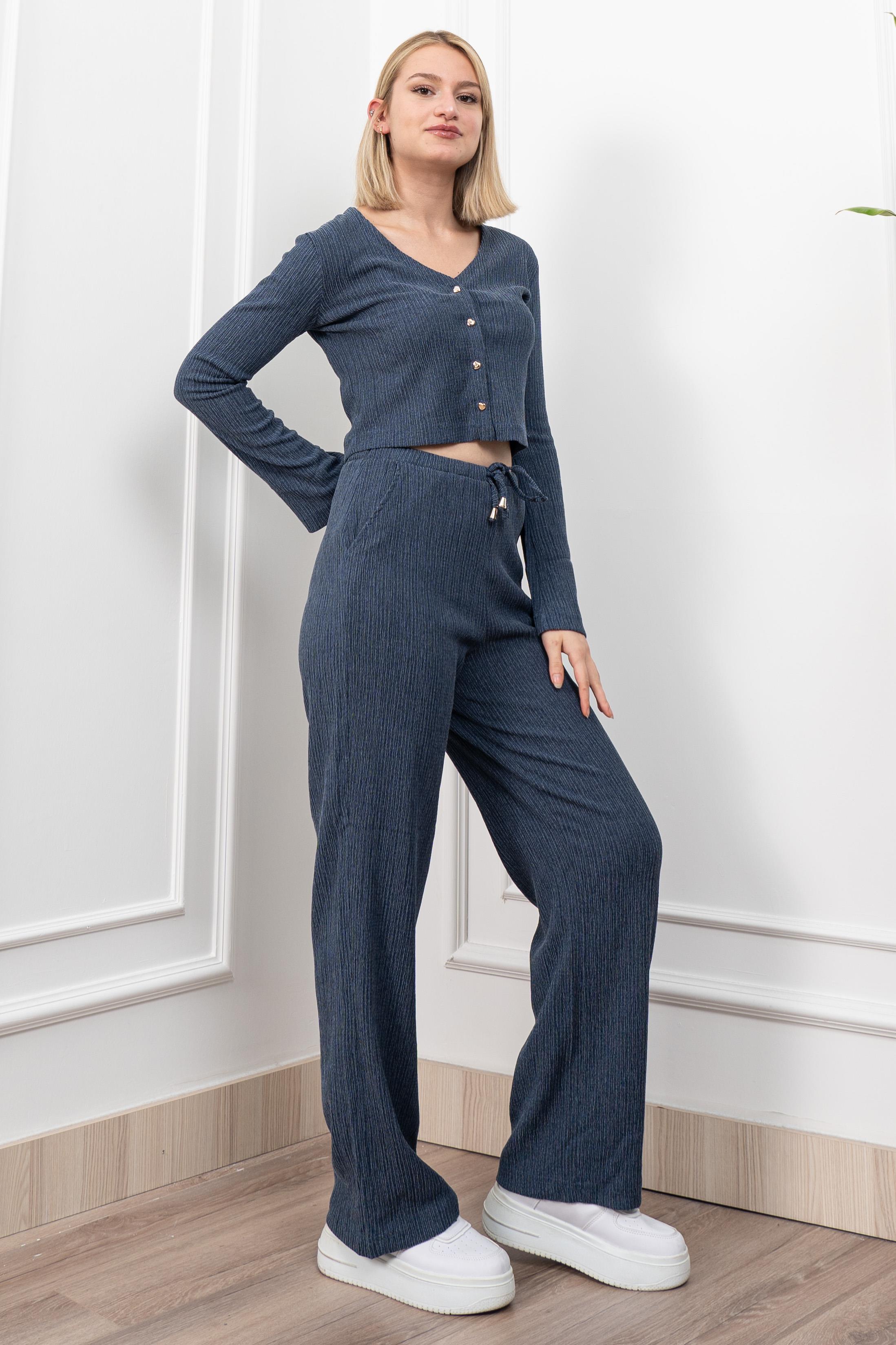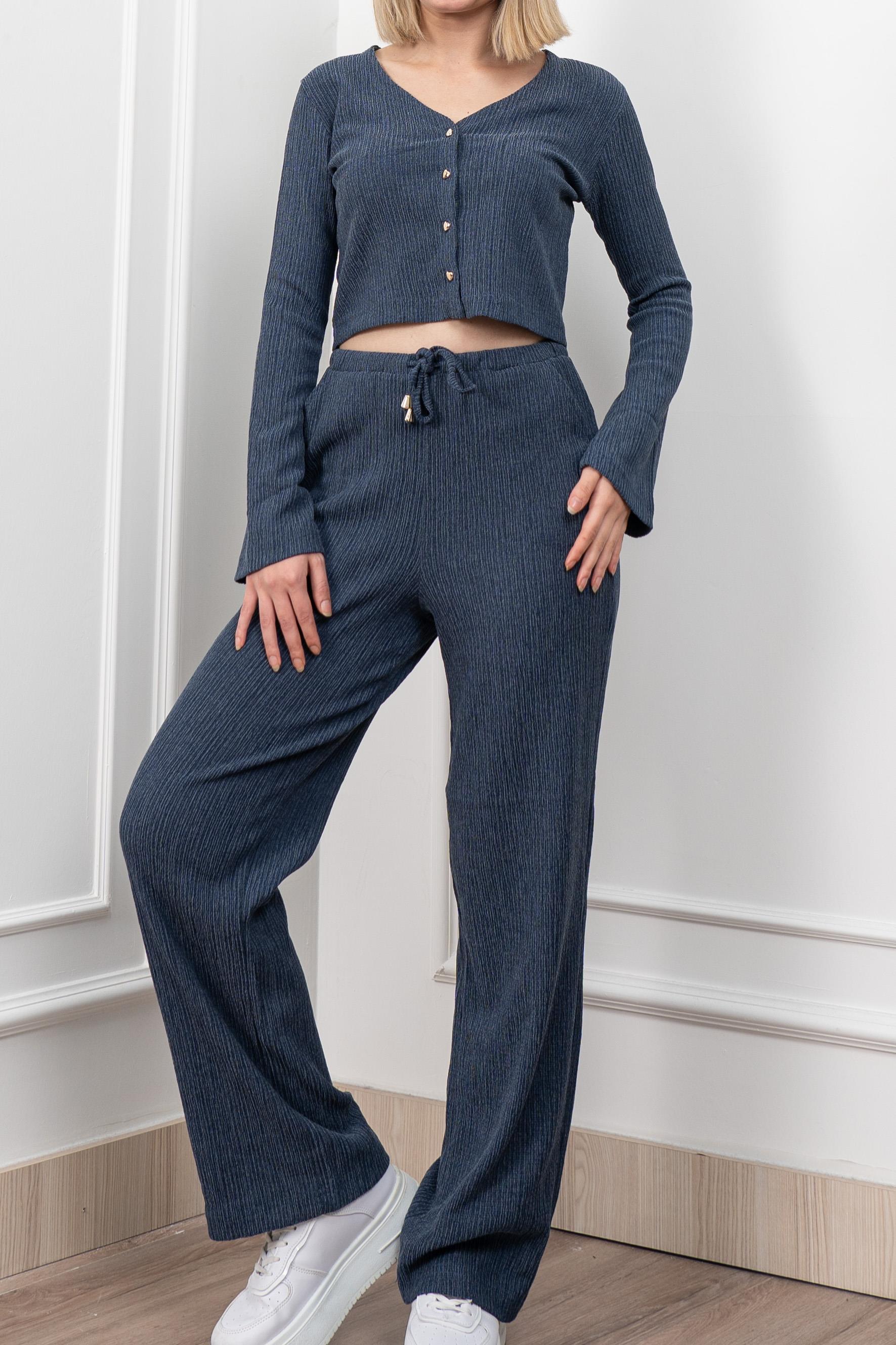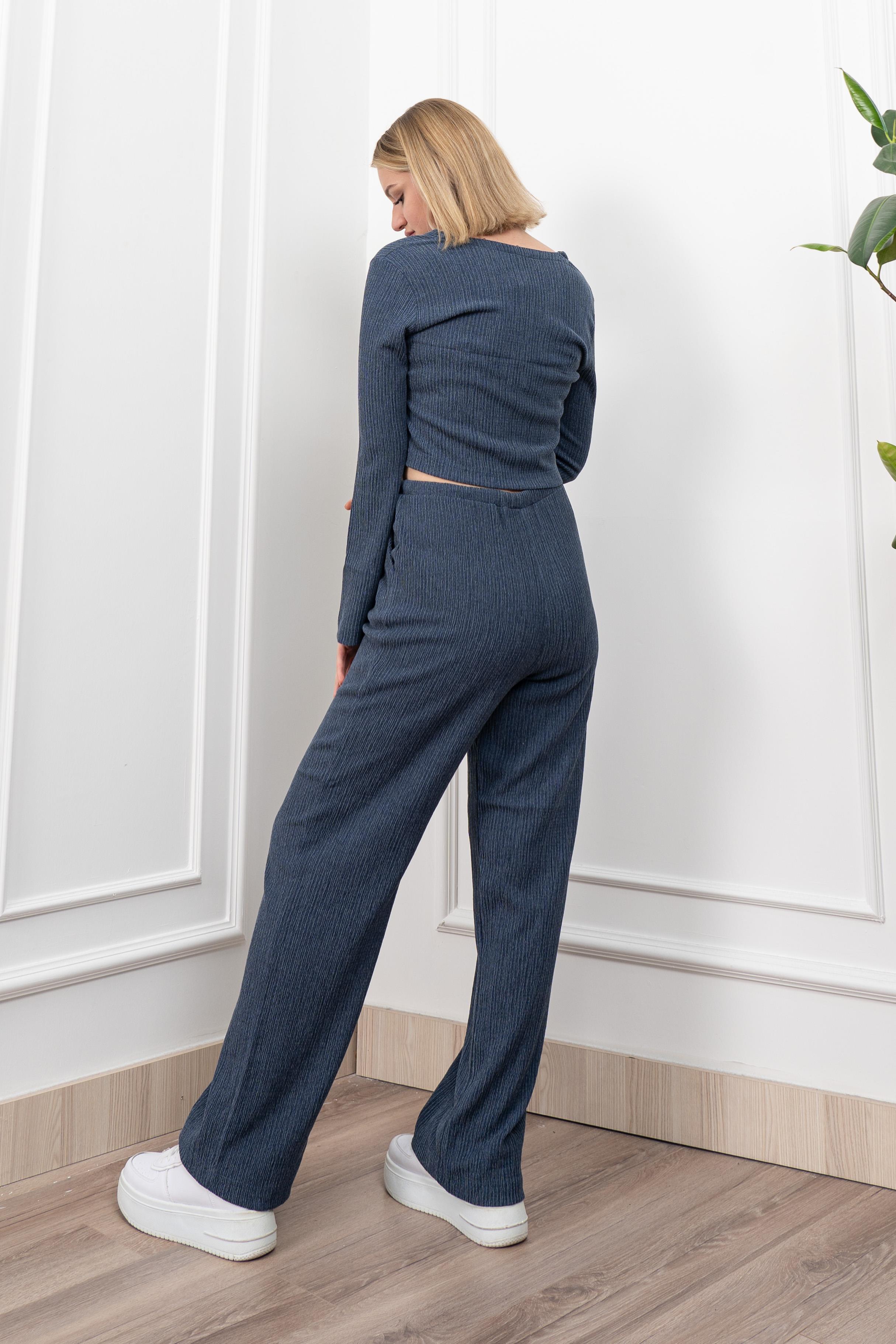 Vual Kumaş Beli Latikli Cepli Rahat Kesim Pantolon ve Uuzn Kollu Düğmeli Bluz Likralı esnek