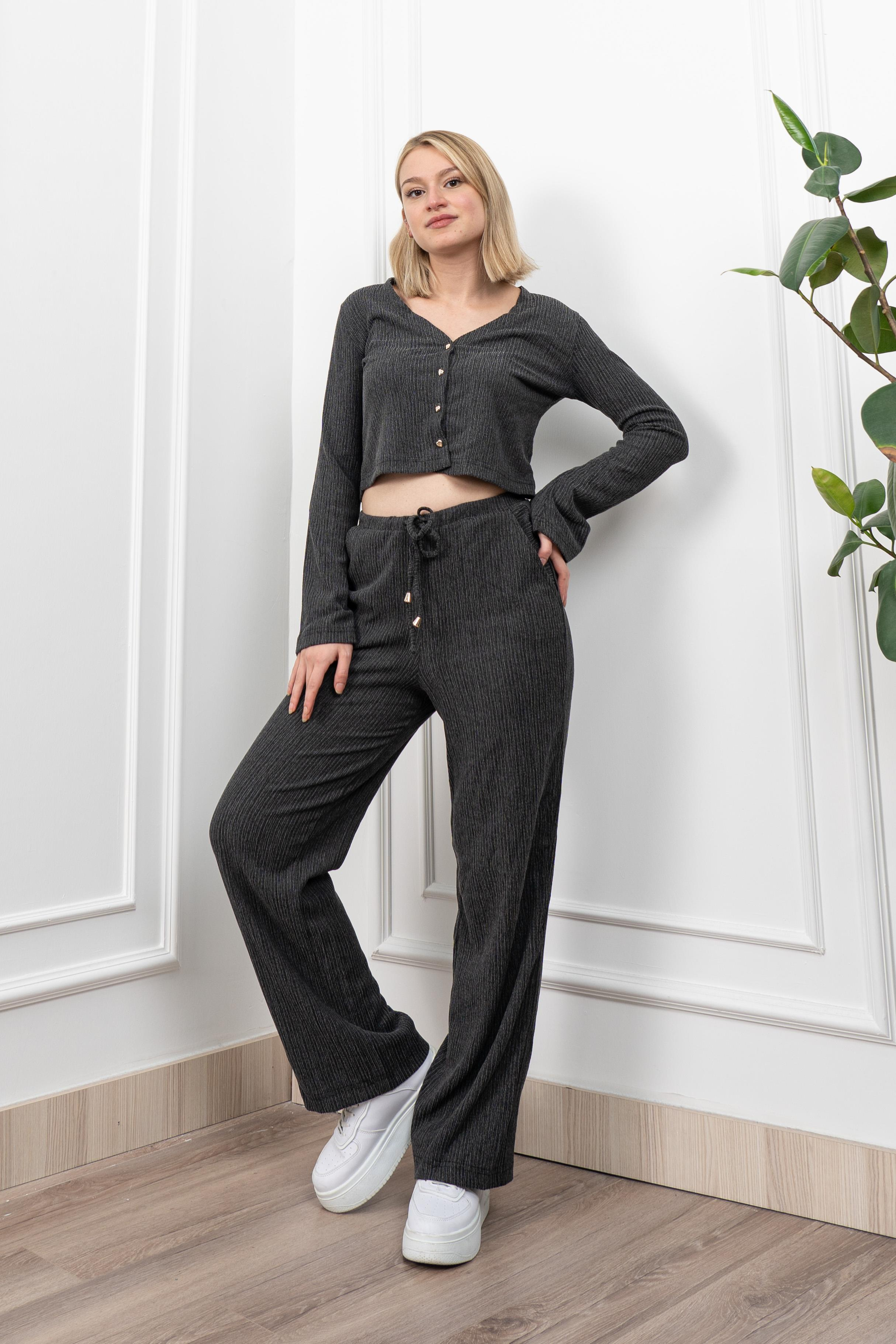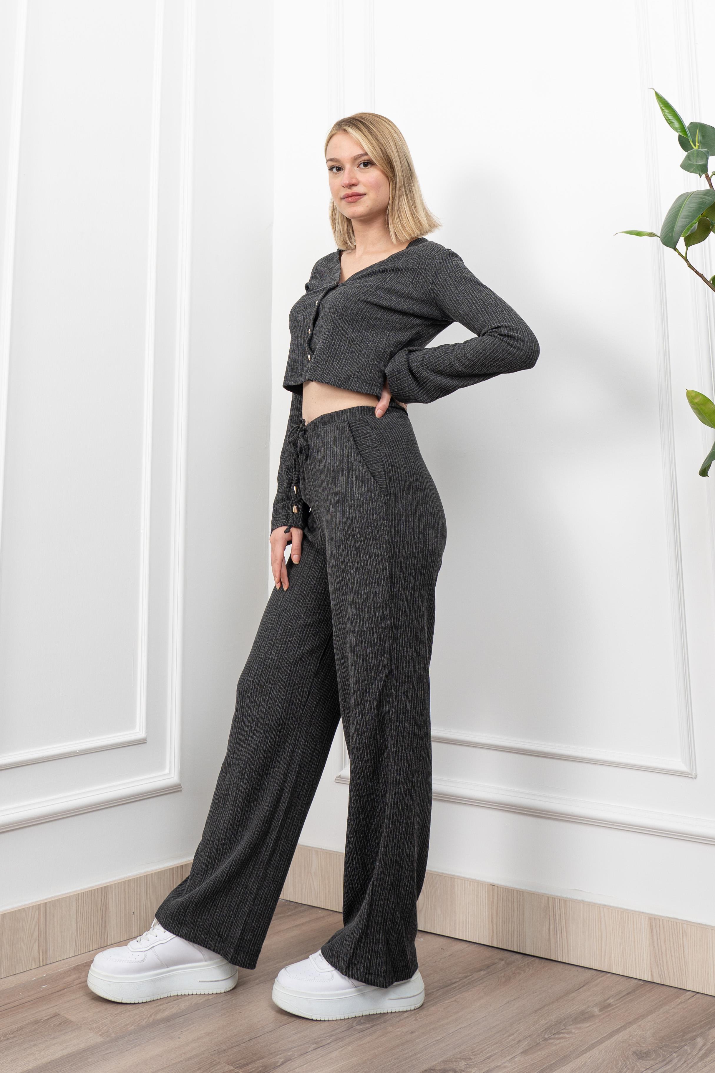 Vual Kumaş Beli Latikli Cepli Rahat Kesim Pantolon ve Uuzn Kollu Düğmeli Bluz Likralı esnek